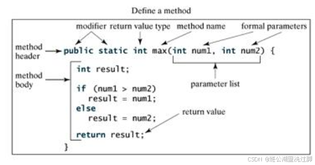 方法包含一个方法头和一个方法体。下面是一个方法的所有部分: