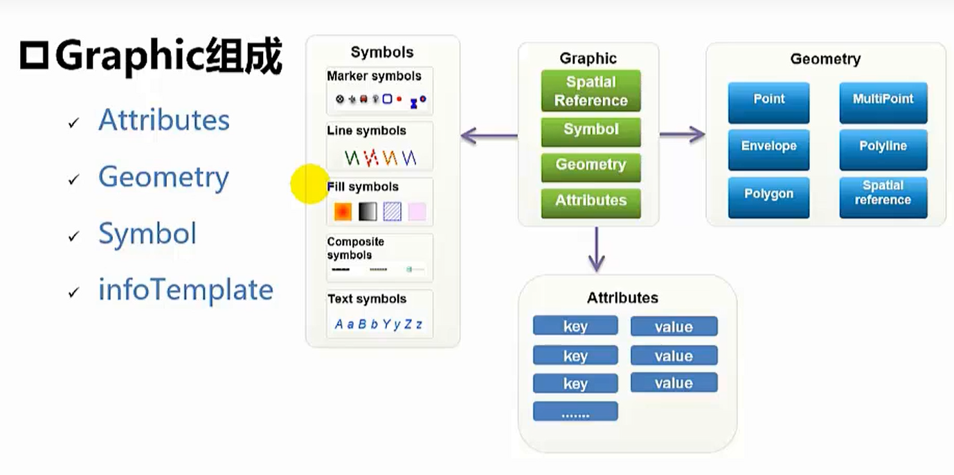 MapView,有GraphicsOverlay,可译为图形覆盖(物),用于容纳要显示在MapView上的临时图形,如查询或分析的结果,高亮,变化的事物、绘制的图形等,GraphicsOverlay由Graphic图形组成,因此也可看做Graphic图形的列表,Graphic图形包含几何、属性和符号。GraphicsOverlay分为静态和动态两种渲染模式,可通过Renderer进行渲染。