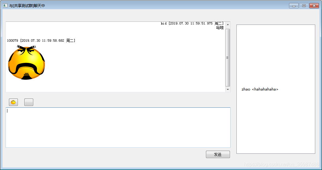 此类主要包括记录当前聊天对象、提供待用户选择的表情包、处理用户输入的信息、以及显示当前聊天对象发来的信息,此处应注意对群消息或私聊消息的不同处理。用户点击表情选择时打开创建表情界面并显示,点击选择相应表情后在输入栏进行显示