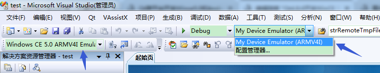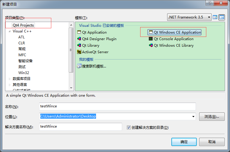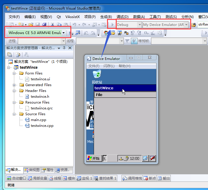 开发时可以在Qt creator下编译为桌面程序,然后使用vs菜单Qt下的打开pro工程。但工程属性要修改成wince的相关配置。你可以新建同名工程然后覆盖sln文件。