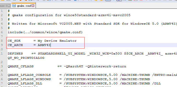3、修改sdk平台配置。将C:\Qt\qt-wince-4.8.6\mkspecs\wince50standard-armv4i-msvc2005目录下qmake.conf文件内容进行如下修改,就是添加你的sdk名称和目标平台