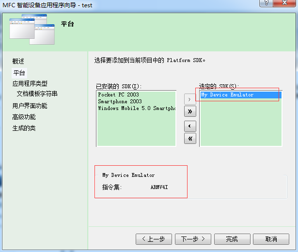 一般的安装VS2008以及sp1补丁后,安装wince sdk,就可以使用vs开发wince程序。我这里安装完DevEmul_SDK.msi后,使用vs2008新建智能设备程序,选择SDK的界面可以看出已经安装的sdk,记下相应的sdk名称,方便在编译wince的qt库使用。如下图所示,我这里要使用的sdk是:My Device Emulator (ARMV4I)