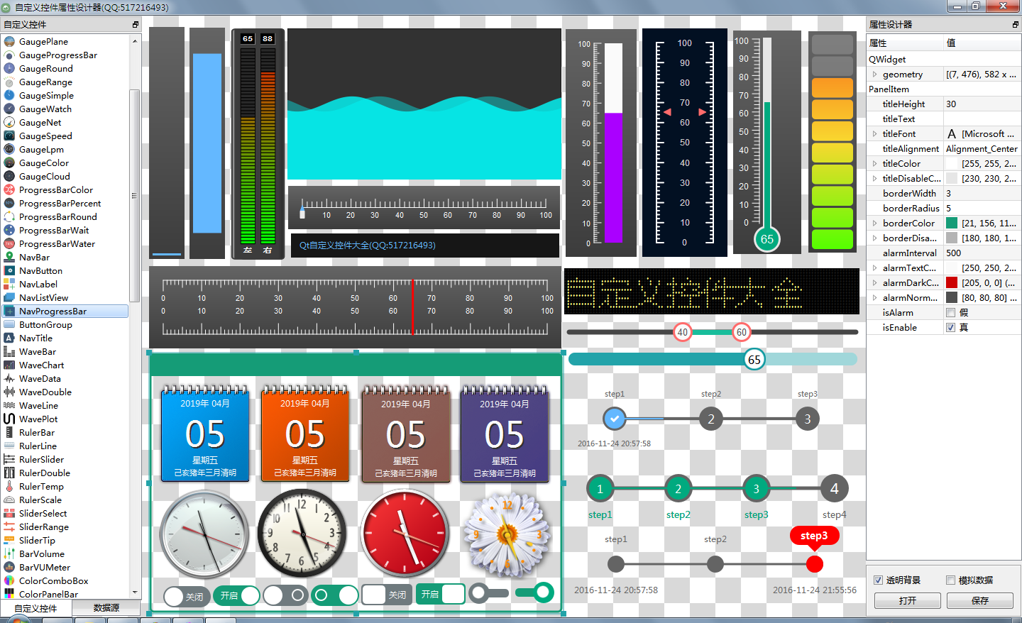 - 超过145个精美控件,涵盖了各种仪表盘、进度条、进度球、指南针、曲线图、标尺、温度计、导航条、导航栏,flatui、高亮按钮、滑动选择器、农历等。远超qwt集成的控件数量。