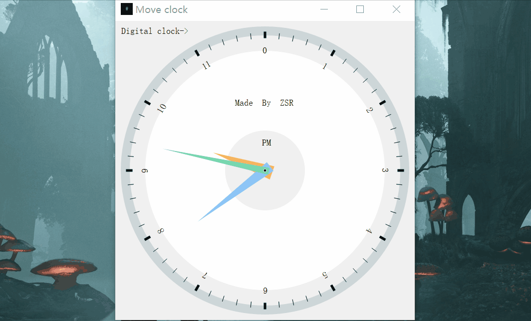 点击运行后首先是一个指针式时钟窗口,点击Digital Clock->可以跳转到数字时钟窗口,再点击Move Clock->可以还原为指针式时钟窗口