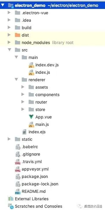 使用 electron-vue 模版创建的 Electron 工程结构如下图。