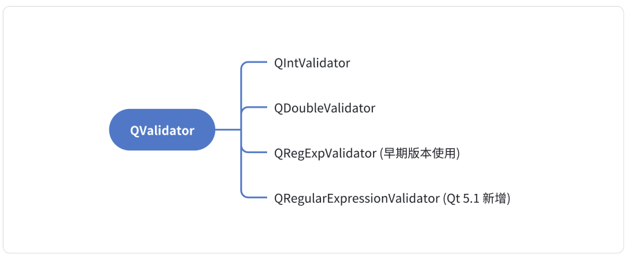 使用 QRegularExpressionValidator 创建一个验证器对象。Qt 中内置了四个主要的验证器对象: