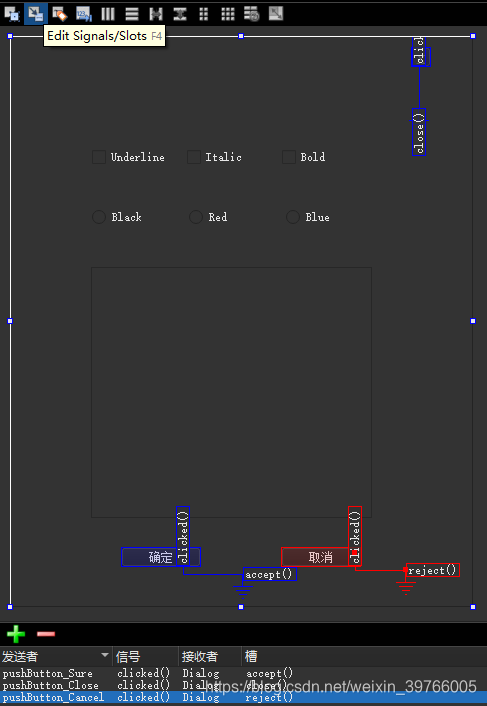connectSlotsByName(Dialog); 函数将搜索 Dialog界面上的所有组件,将信号与槽函数匹配的信号和槽关联起来。如void Dialog::on_checkBox_Underline_clicked(bool checked)函数正好是checkBox_Underline的clicked的槽函数,如同执行了下面的这样一条语句:
