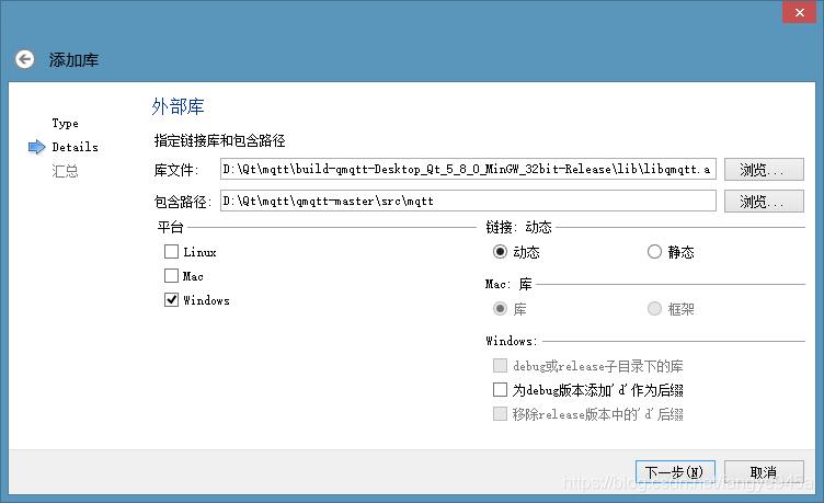 其中库文件选择刚刚编译出来的lib文件夹下的libqmqtt.a,包含路径选择工程源码目录下的mqtt文件夹,选择平台,然后点击下一步,如图所示: