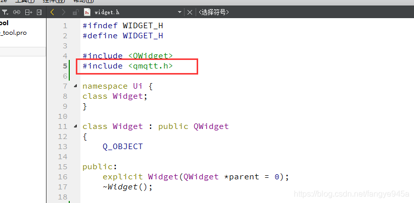 在需要使用mqtt的类的头文件中添加qmqtt.h头文件即可使用了,如下图所示。