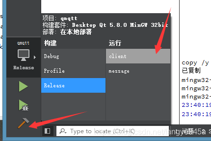2、选择默认构建套件后,点击Release->client,再点击“锤子”进行编译。