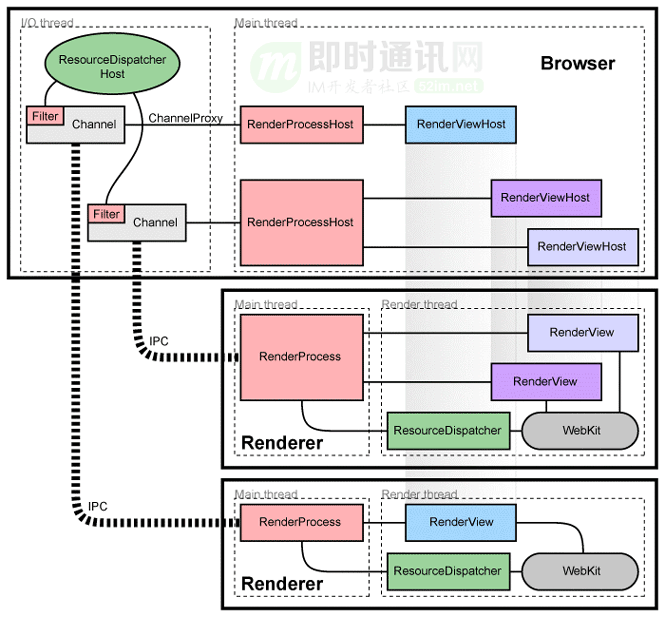 - 3)ResourceDispatcher 处理资源请求,当页面需要请求资源时,通过 ResourceDispather 创建一个请求 ID 转发到 IPC,在 Browser 进程中处理后返回。