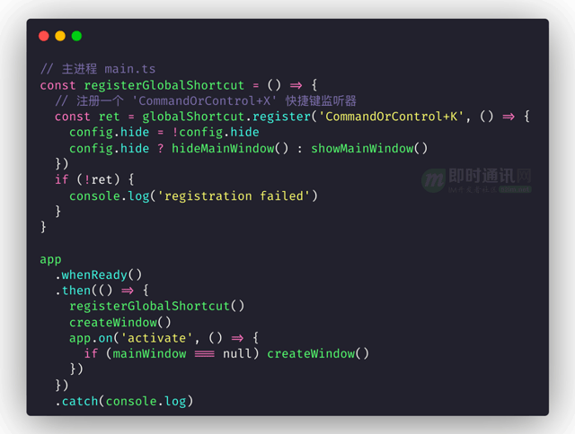 注册全局快捷键,控制 mainWindow 的显示和隐藏。在 Electron 中,首先定义 registerGlobalShortcut 方法,在 app 启动后注册快捷键,主要是在主进程中操作。