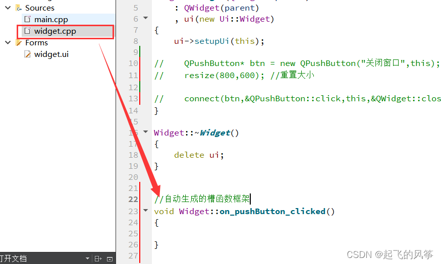 (2)在"widget.cpp"中⾃动⽣成槽函数定义.
