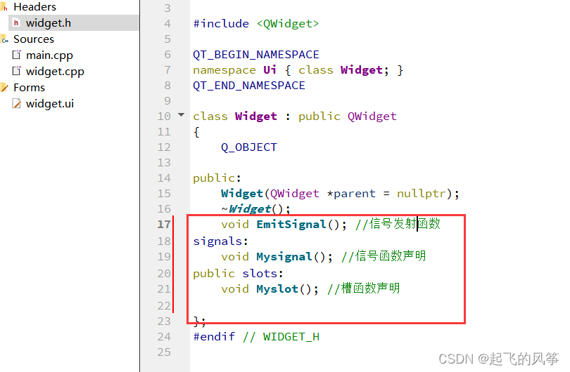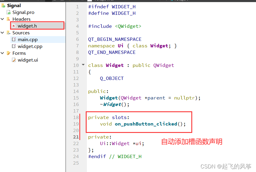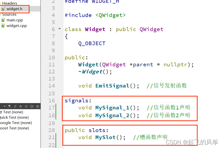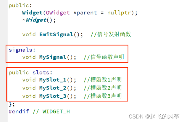 1、在widget.h中声明⾃定义的信号和槽,如图所⽰;