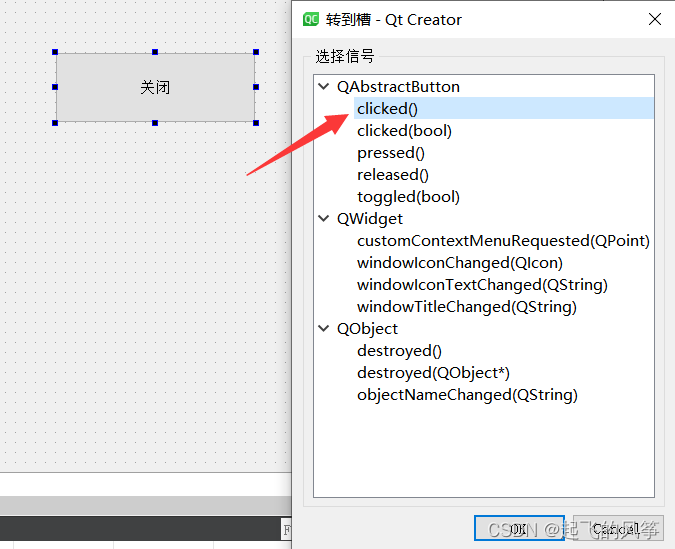 - 当单击"转到槽..."之后,出现如下界⾯:对于按钮来说,当点击时发送的信号是:clicked(),所以此处选择:clicked()