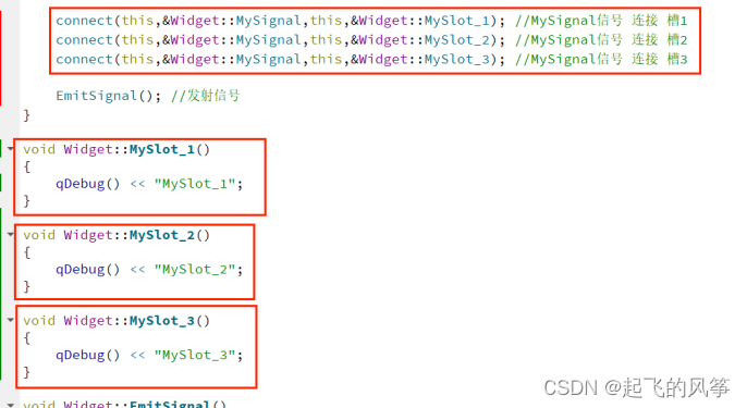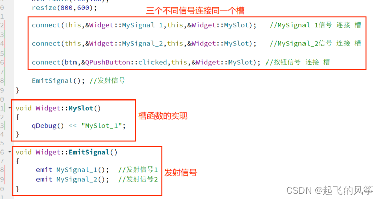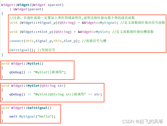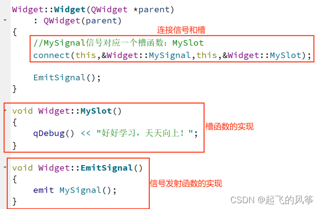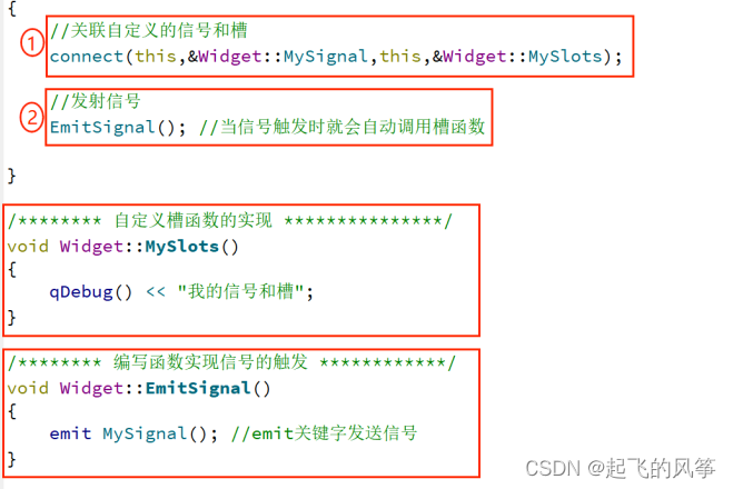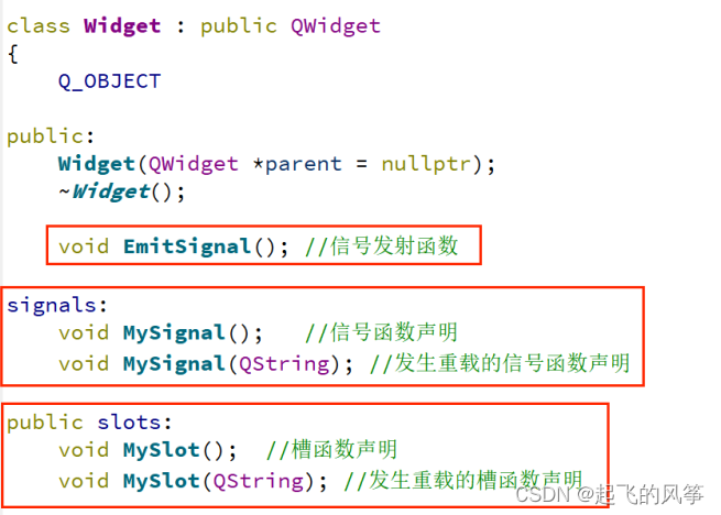 - 自定义的信号函数和槽函数应该遵循一定的书写规范,例如在类的声明部分中使用