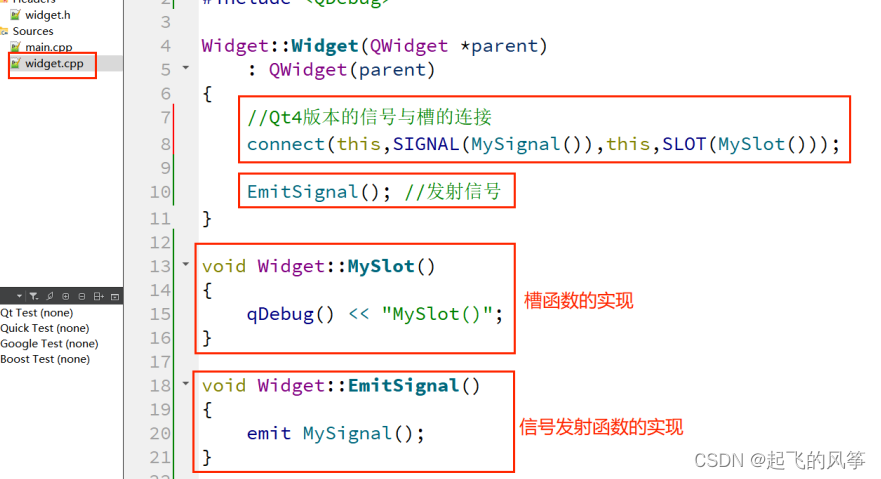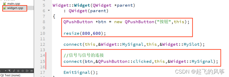 2、在"widget.cpp"中实现槽函数,信号发射函数以及连接信号和槽;