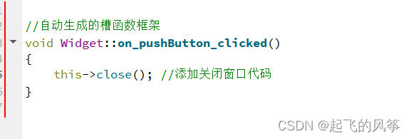 6、在槽函数函数定义中添加要实现的功能.实现关闭窗⼝的效果(即当我们运行代码点击关闭按钮之后窗口就会自动关闭)