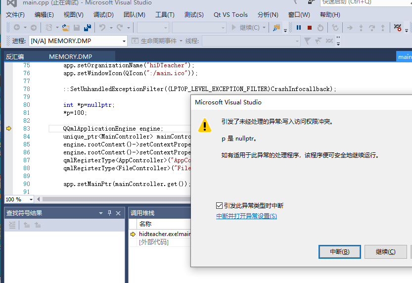 备注:如果工程同时加载了 easyloggin++ 日志,则pro配置中需要 取消错误打印选项 ,否则不会生成dmp 文件,因为错误被这个库 捕获了 但是它还记录不了太多有用的信息