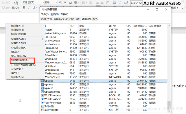 在任务管理器里面找到对应的进程,右键-> 创建转储文件(create dump file)。弹一个对话框会显示保存文件的位置: