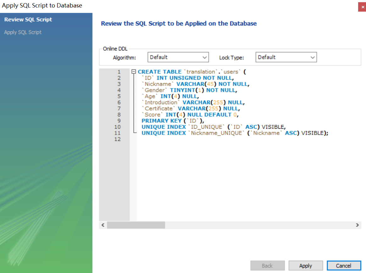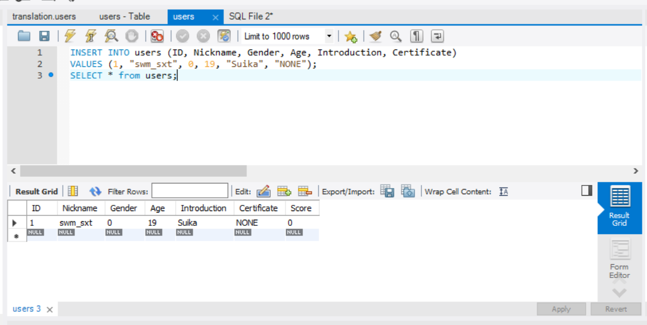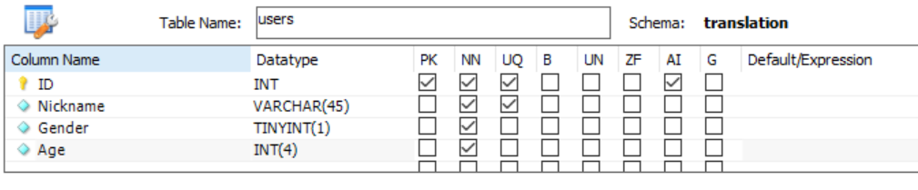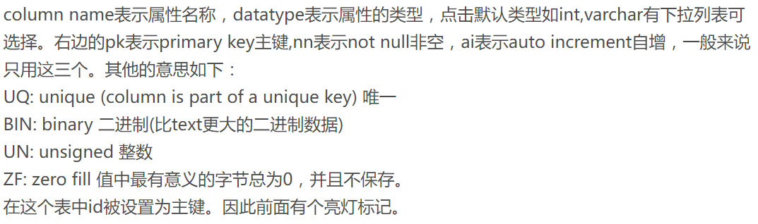 大致设计一下这个表需要的数据,有用户的id,Nickname(这里我打算用Nickname作为登录的唯一标识),其他个人信息、语言资质证明、积分等。需要提一下这些数据的类型,VARCHAR表示是字符串,INT和TINYINT都是表示整数,后面的数字是显示宽度,反正大概这么写就行了,具体的暂时不用理解太多。勾选的东西PK表示这个元素是这张表的主键,也就是主要的脉络。NN是Not Null,不能是空的。UQ表示不能重复。AI表示这个元素会自增,就是塞数据的时候不给它数据它就自己++。Default是默认值,这里将score设置为默认0。其他的可以参考给的资料,说得很详细了。