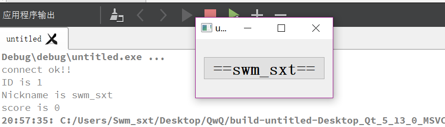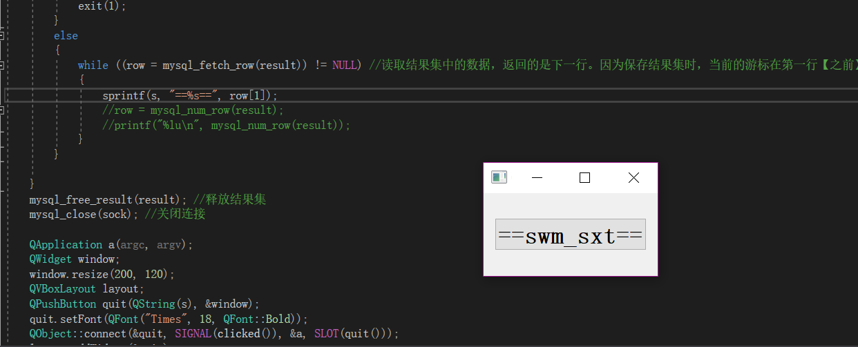 #include "mainwindow.h" #include <QApplication> #include <mysql.h> #include <cstdio> #include <qpushbutton> #include<qfont> #include <QVBoxLayout> char S[100]; int main(int argc, char *argv[]) { MYSQL mysql, *sock; //声明MySQL的句柄 const char * host = "127.0.0.1"; //因为是作为本机测试,所以填写的是本地IP const char * user = "root"; //这里改为你的用户名,即连接MySQL的用户名 const char * passwd = "*****"; //这里改为你的用户密码 const char * db = "translation"; //这里改为你要连接的数据库的名字,一个数据可能有几张表 unsigned int port = 3306; //这是MySQL的服务器的端口,如果你没有修改过的话就是3306。 const char * unix_socket = nullptr; //unix_socket这是unix下的,我在Windows下,所以就把它设置为NULL unsigned long client_flag = 0; //这个参数一般为0 const char * i_query = "select ID, Nickname, score from users"; //查询语句,从那个表中查询,这里后面没有; MYSQL_RES * result; //保存结果集的 MYSQL_ROW row; //代表的是结果集中的一行 //my_ulonglong row; mysql_init(&mysql); //连接之前必须使用这个函数来初始化 if ((sock = mysql_real_connect(&mysql, host, user, passwd, db, port, unix_socket, client_flag)) == nullptr) //连接MySQL { printf("fail to connect mysql \n"); fprintf(stderr, " %s\n", mysql_error(&mysql)); exit(1); } else { fprintf(stderr, "connect ok!!\n"); } if (mysql_query(&mysql, i_query) != 0) //如果连接成功,则开始查询 .成功返回0 { fprintf(stderr, "fail to query!\n"); exit(1); } else { if ((result = mysql_store_result(&mysql)) == NULL) //保存查询的结果 { fprintf(stderr, "fail to store result!\n"); exit(1); } else { while ((row = mysql_fetch_row(result)) != NULL) //读取结果集中的数据,返回的是下一行。因为保存结果集时,当前的游标在第一行【之前】 { printf("ID is %s\n", row[0]); //打印当前行的第一列的数据 printf("Nickname is %s\n", row[1]); //打印当前行的第二列的数据 printf("score is %s\n", row[2]); sprintf_s(S, "==%s==", row[1]); //row = mysql_num_row(result); //printf("%lu\n", mysql_num_row(result)); } } } QApplication a(argc, argv); QWidget window; window.resize(200,120); QVBoxLayout layout; QPushButton quit(S,&window); quit.setFont(QFont("Times",18,QFont::Bold)); QObject::connect(&quit,SIGNAL(clicked()),&a,SLOT(quit())); layout.addWidget(&quit); window.setLayout(&layout); window.show(); return a.exec(); }