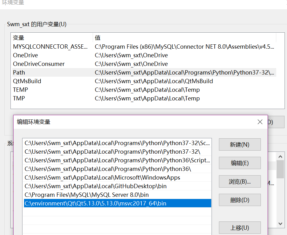 如果你希望打开exe文件(一般是在)能直接运行程序,还需要配置一下环境变量。最简单的方法是win+Q在搜索框中直接输入“环境变量”,在用户和系统环境变量中都可以找到一个叫PATH的,随便哪个都可以,在其中加入Qt的msvc2017_64\bin即可。搞定之后双击exe即可弹出程序感觉就跟真的在做开发一样^_^。