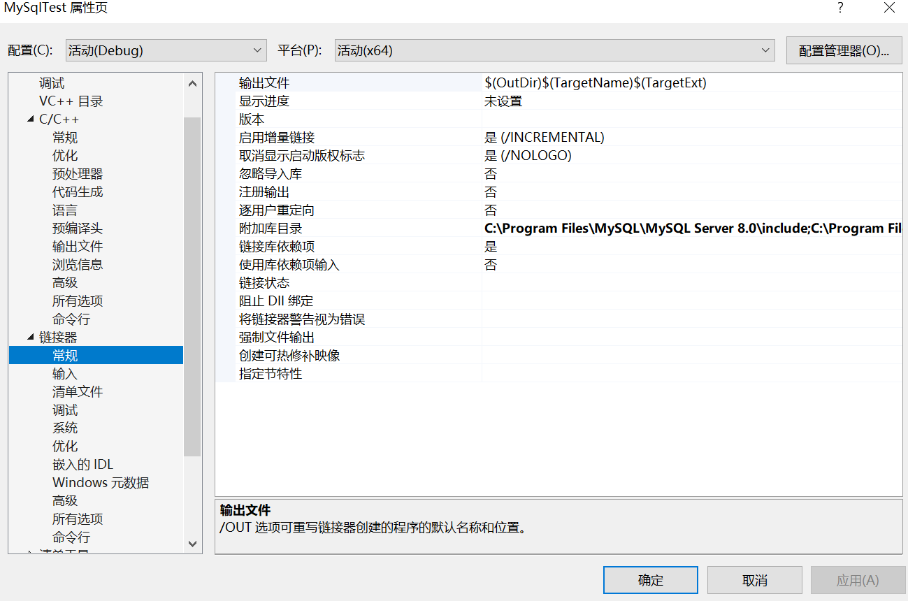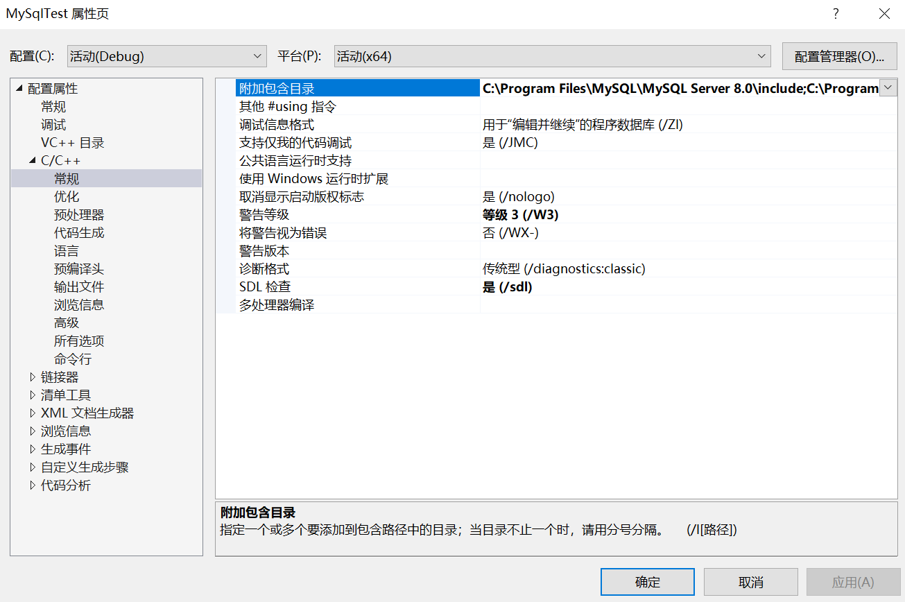 然后在项目->属性->c++->常规->附加包含目录中加上MySQL的include目录,在链接器->常规->附加库目录中加上lib目录,偷懒起见我两个都写上了C:\Program Files\MySQL\MySQL Server 8.0\include;C:\Program Files\MySQL\MySQL Server 8.0\lib,需要根据自己安装MySQL的位置进行修改。
