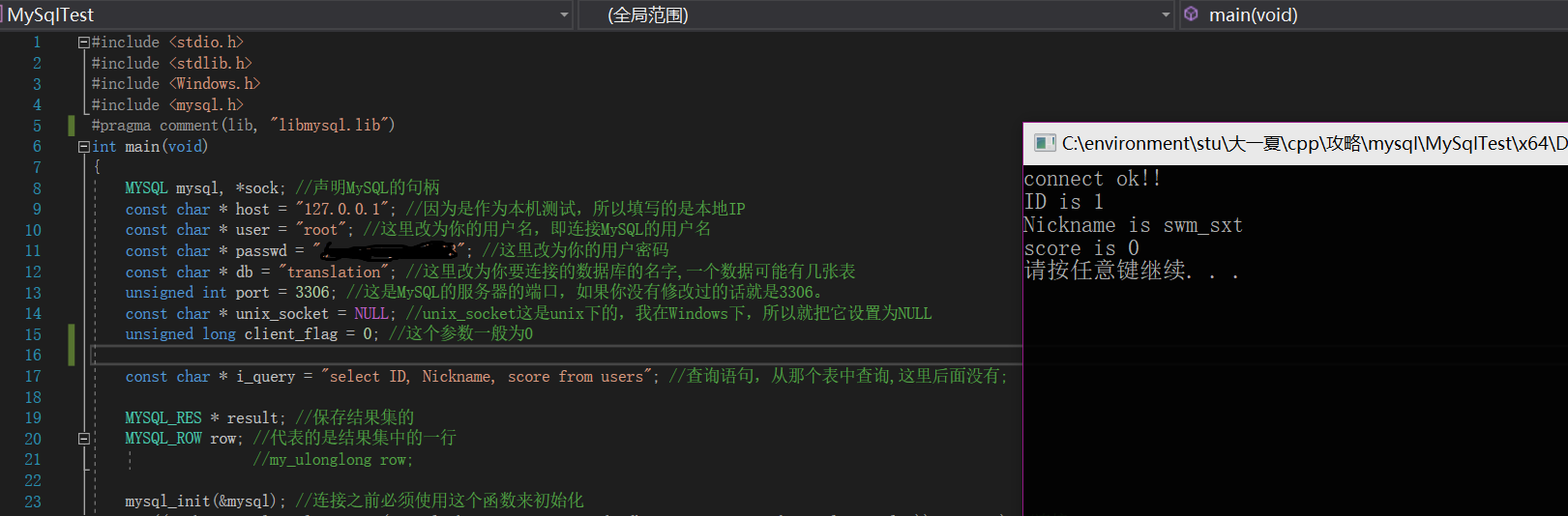 如果你是按照我所说的方法安装,大概率是装上了64位的MySQL(不知道为啥没有弹出来让我选32位还是64位)。在VS中新建一个空项目,把参考资料中大佬给出来的代码贴上去,改一改然后咱们来看看能不能跑。观察这份代码,可以发现我们需要先写好连接MySQL的相关设置,然后使用mysql.h中给的函数直接进行连接,查询等操作。如果你希望自己的代码鲁棒性好一些还可以加入出错时的提示。