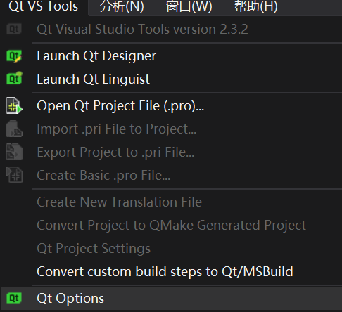 这时需要退出VS重启,VS会提示安装Qt的辅助工具,再次打开VS看到一个Qt VS Tools,选择其下拉菜单中的Qt Options,将之前安装的Qt的安装路径Add进去