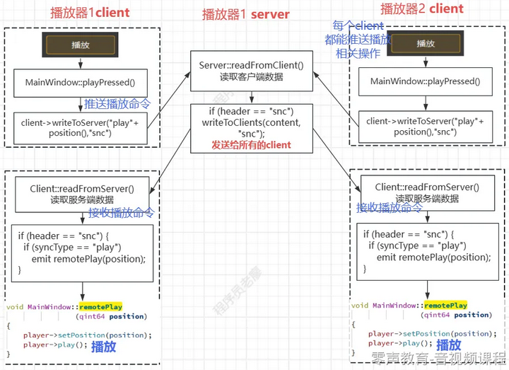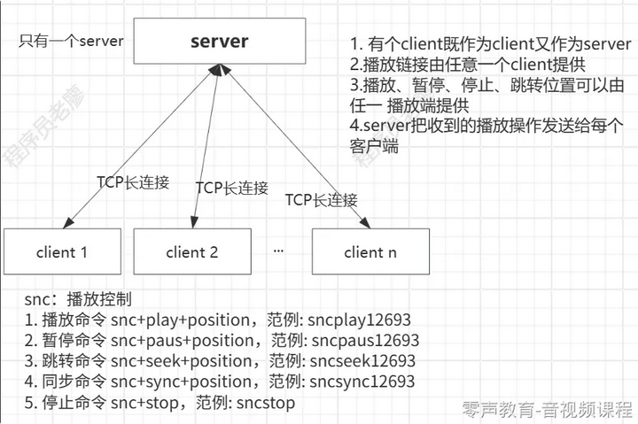 播放、暂停、跳转、停止我们都很容易理解,重点是同步命令snc+sync+position,server怎么做的,client收到sync命令后又怎么处理的