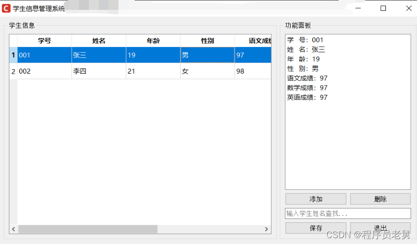 本节我们教大家用 Qt 实现一个带界面的学生信息管理系统,完成后的系统主界面如下图所示: