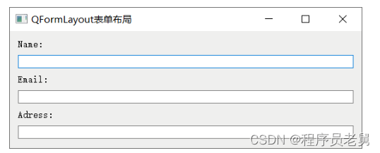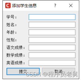 设计图 2 所示的添加学生信息界面非常简单,只需要自定义一个继承自 QDialog 的窗口类,用 QVBoxLayout 作为该窗口的布局工具,并依次将 QFormLayout 和 QHBoxLayout 添加到 QVBoxLayout 中:
