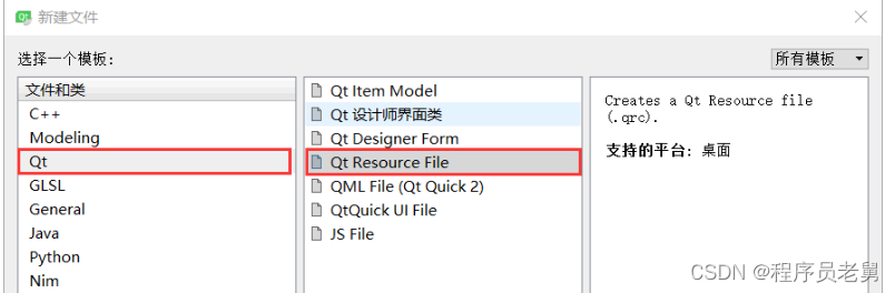 首先,我们要在项目中新建一个后缀名为 qrc 的文件,鼠标移动到项目名上右击选择“添加新文件”,Qt Creator 会弹出如下对话框:
