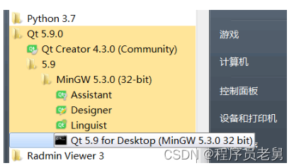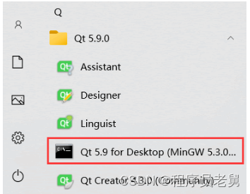 在“开始”中找到 Qt 命令行程序并打开,如下图所示: