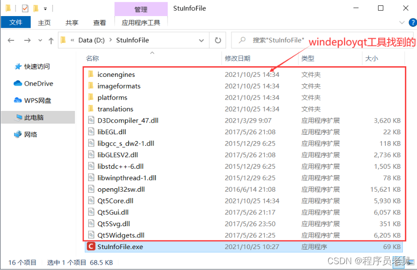 在命令行中,先执行 “cd D:\StuInfoFile” 命令进入 StuInfoFile 文件夹,然后再执行 “windeployqt StuInfoFile.exe” 命令。windeployqt 是 Qt 提供的 Windows 平台打包工具,它能找到 StuInfoFile.exe 可执行文件需要的所有动态链接库,并将它们拷贝到当前文件夹中。