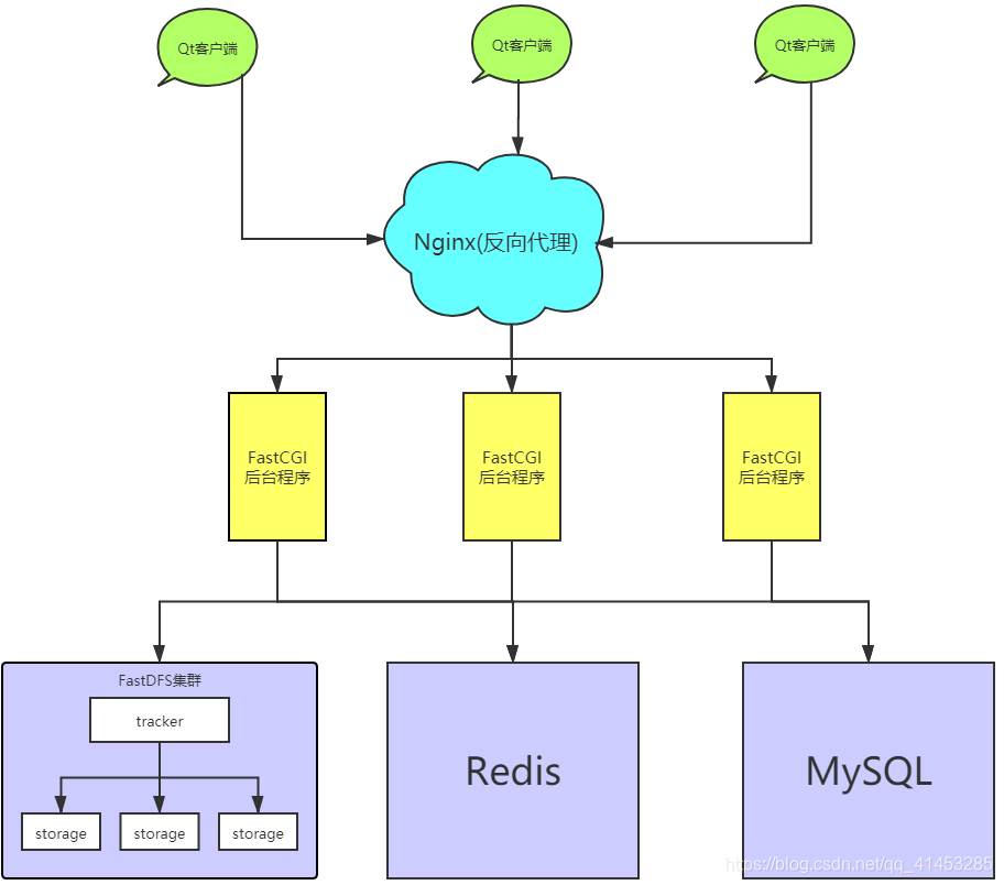 - 后端使用Nginx充当代理服务器,将Qt客户端发送过来的请求转发给后台的FastCGI进行进行处理。