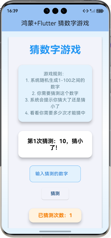 本项目通过鸿蒙+Flutter技术栈实现了一个功能完整、界面美观的猜数字游戏。项目虽然简单,但涵盖了Flutter开发的核心知识点,适合初学者学习和参考。