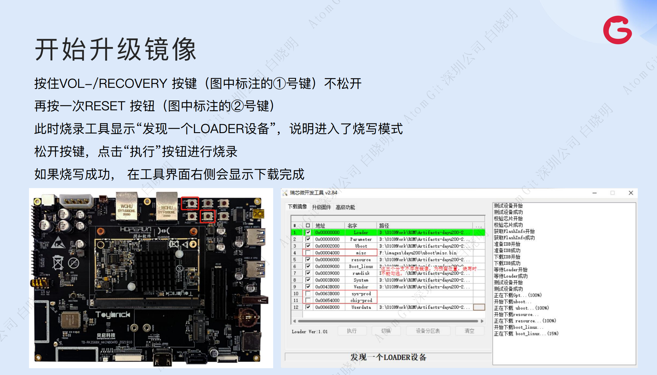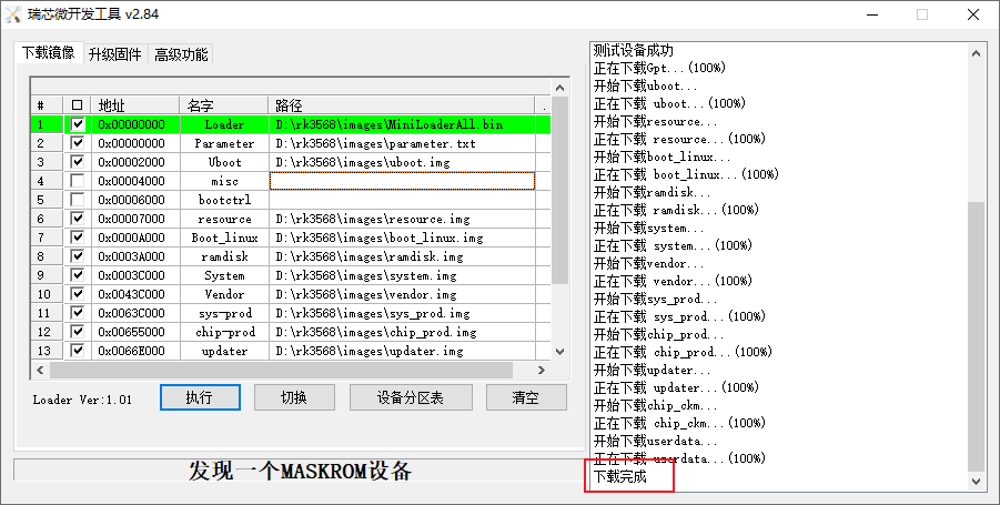 5、点击执行按钮,等待系统进行烧录。烧录完成后会显示“下载完成”,且开发板将自动重启