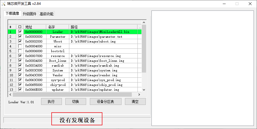 3、对开发板进行操作。同时长按 RECOVERY 键和 RESET 键,使瑞芯微开发工具下方显示状态变为“没有发现设备”