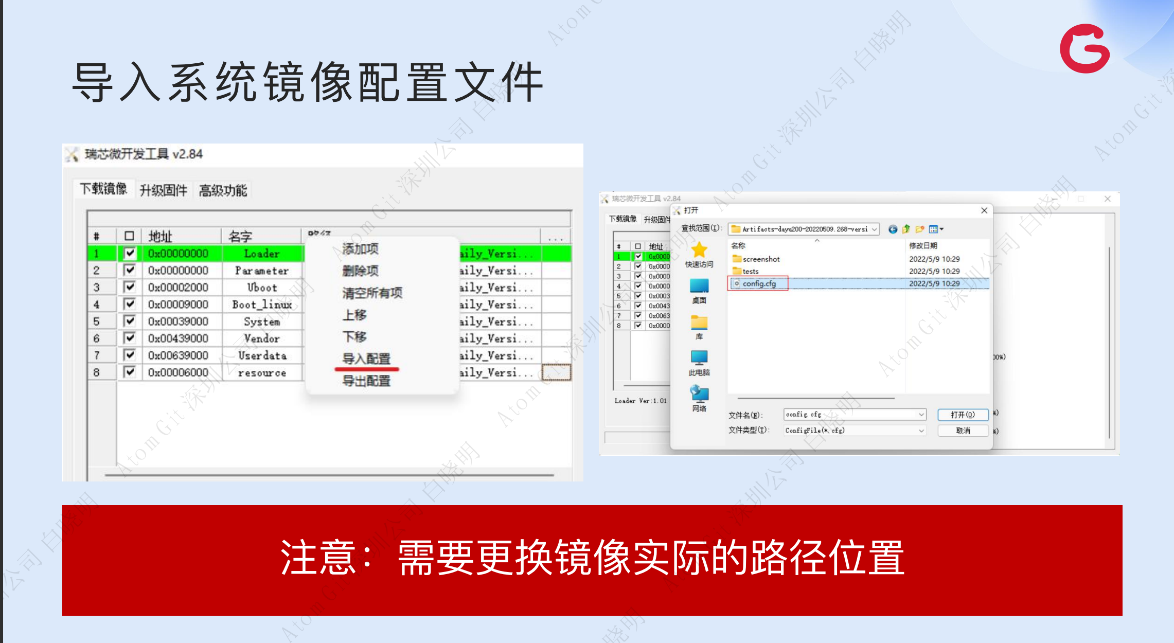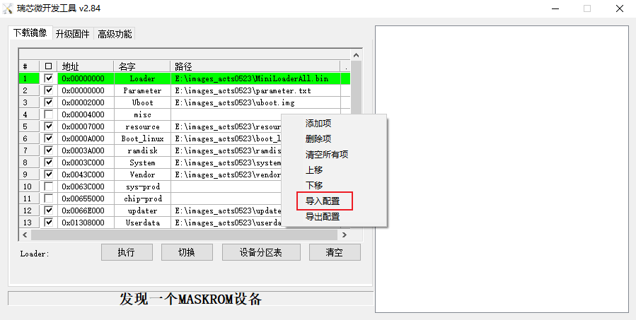 2. 在列表中点击右键,选择导入配置,进入下载下来并经解压的镜像路径,选择对应的配置文件并打开。注意检查所导入的路径是否正确