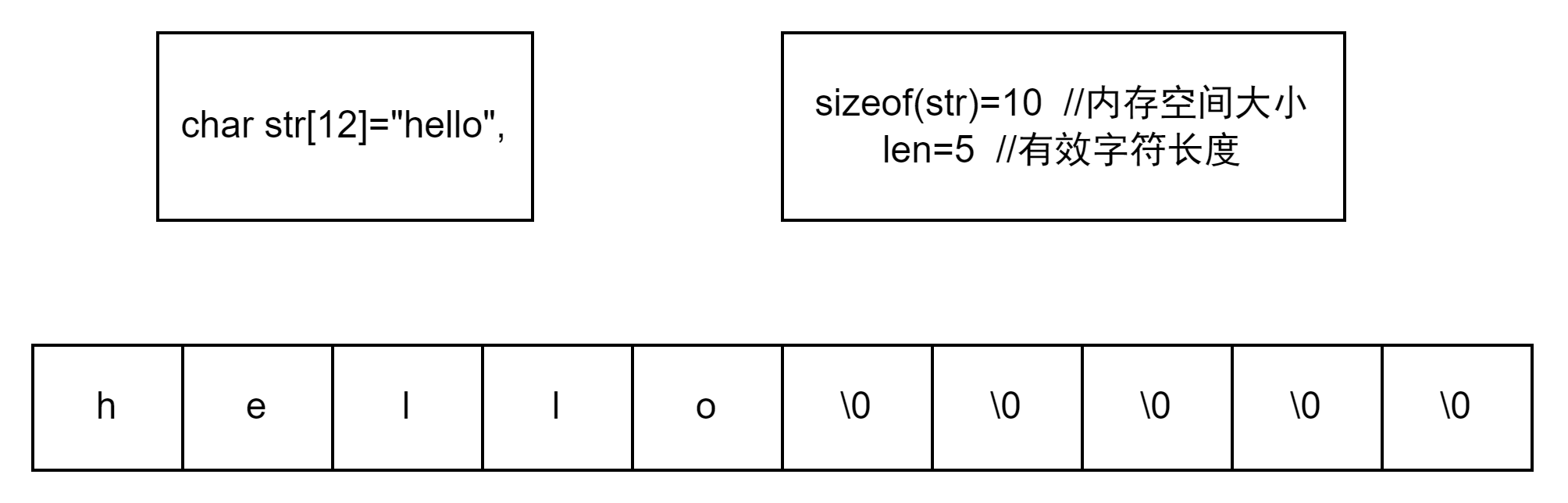 char str[50]="hello"; 字符串长度 5 从第一个字符开始计数 到字符串结束标志\0之前