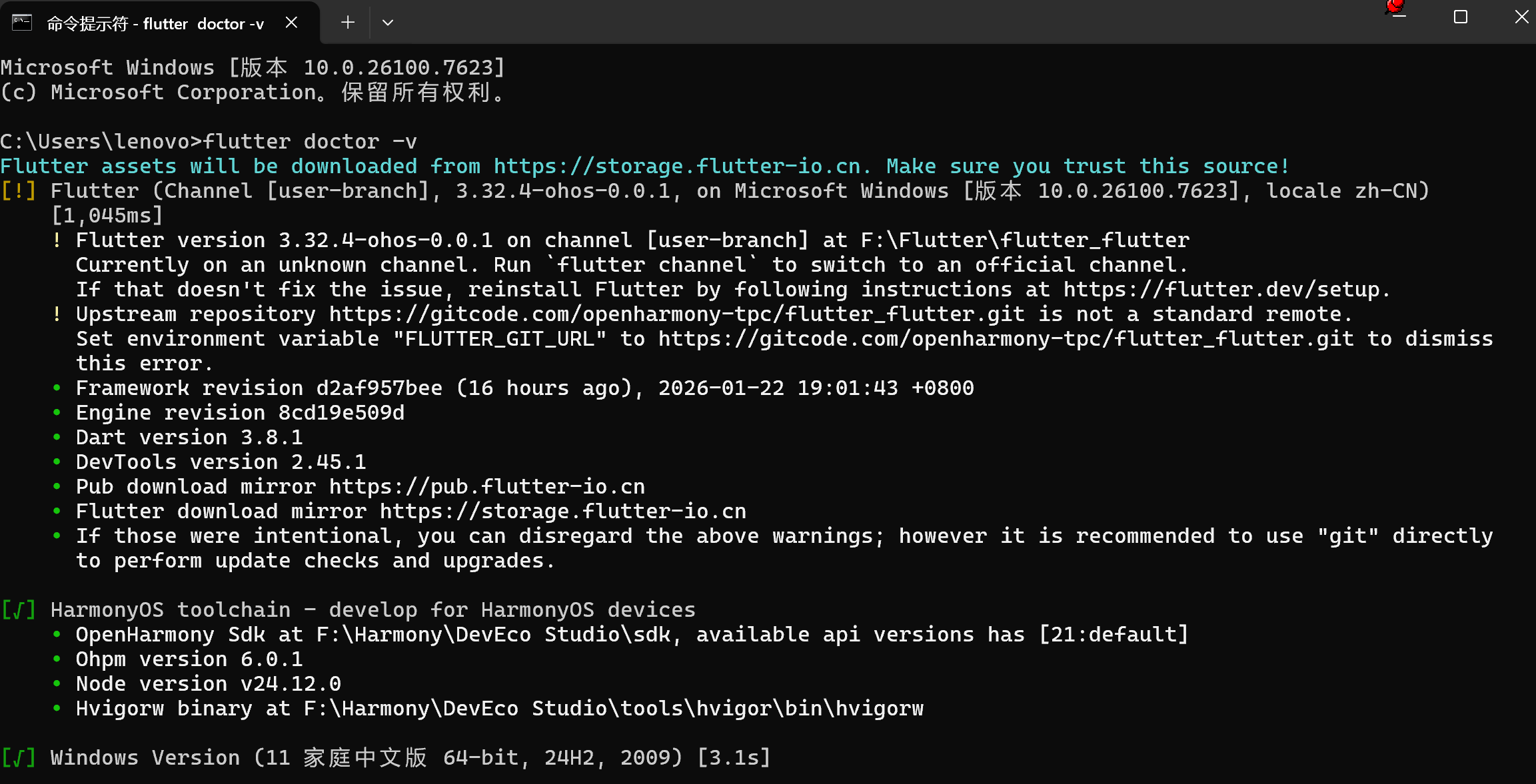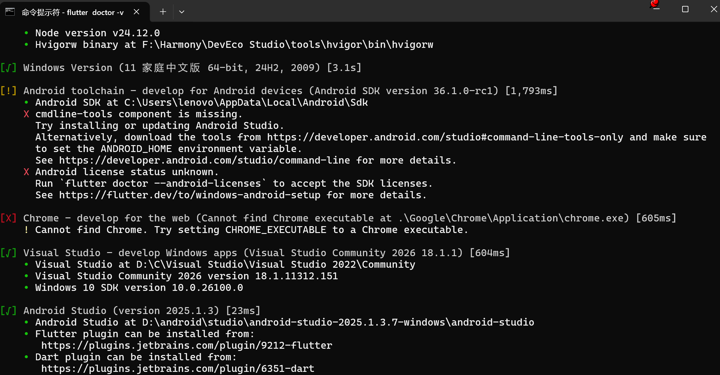 验证环境配置:Flutter没有报错经过查询这是正常现象可以不需要管理。