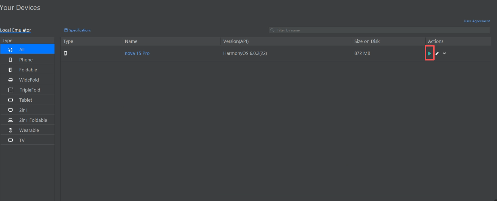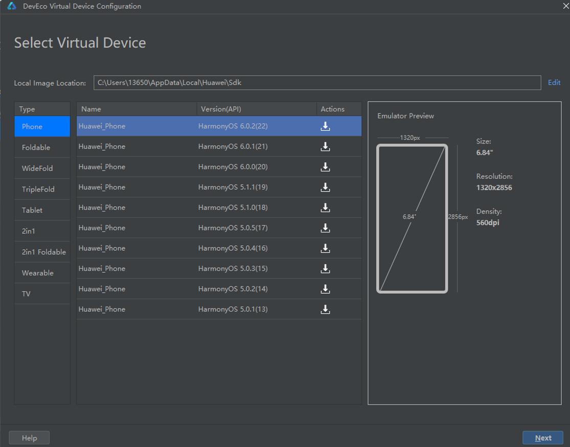 选择和新建项目sdk版本对应的phone模拟器,这里我用的sdk版本是HarmonyOS 6.0.2(22),因此我选择第一个,点击action下的下载按钮会开始下载模拟器镜像。
