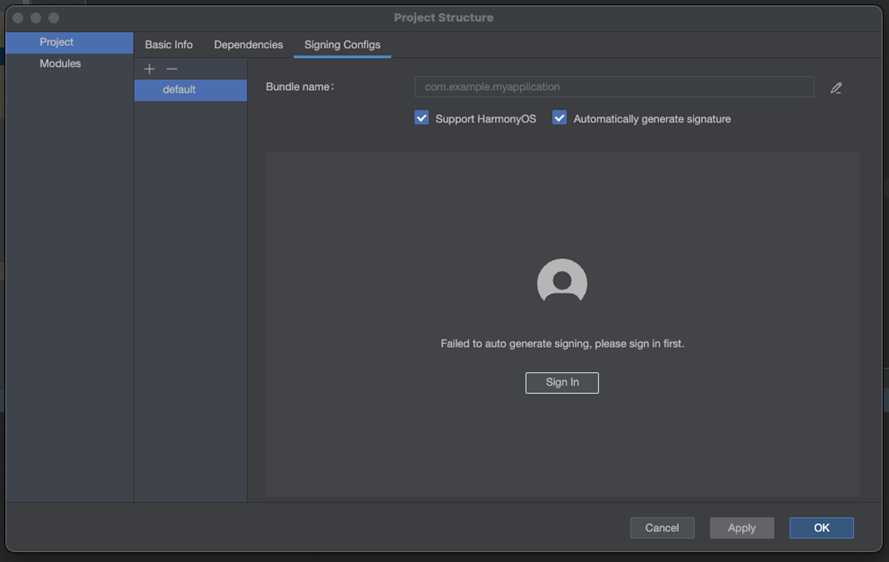 连接真机,点击 File > Project Structure,在弹窗界面点击 Signing Configs,勾选 Support HarmonyOS 和 Automatically generate signature,然后点击 Sign In 登录华为账号,并签名。