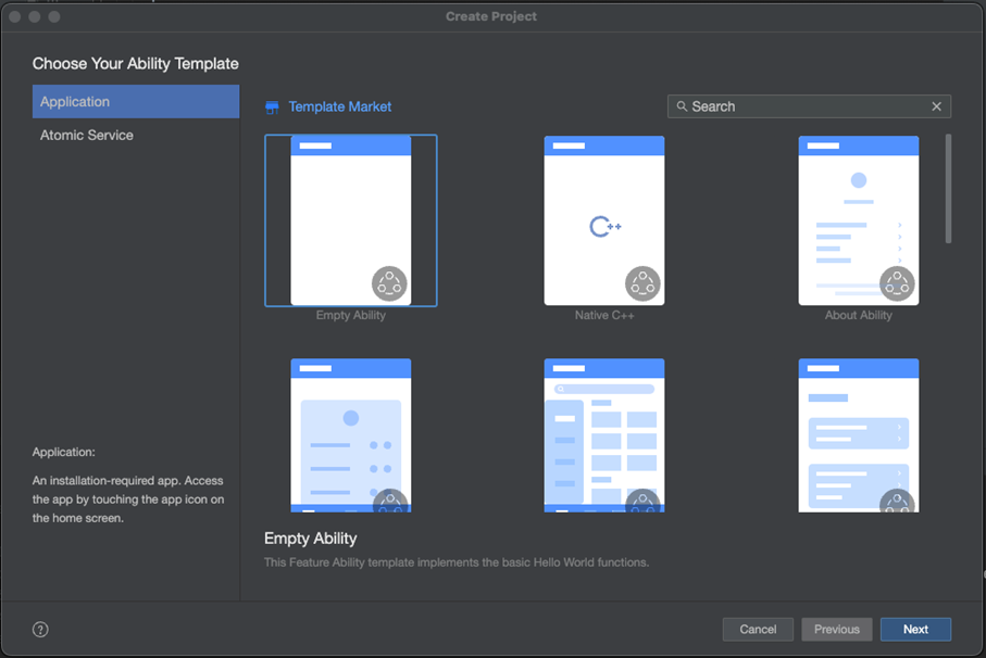 打开DevEco Studio,点击 File > New > Create Project,选择创建 Empty Ability 工程,如图所示: