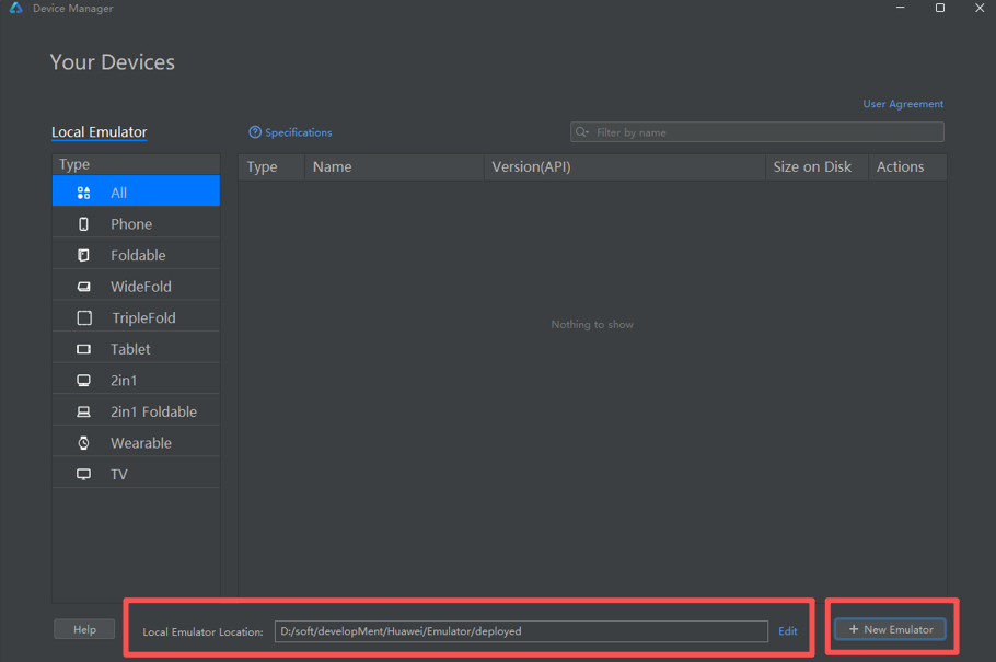 点击下方模拟器保存路径进行配置,不建议放在C盘,因为会占用较大存储空间。配置完本地保存路径后,点击右侧New emulator进行新增模拟器。