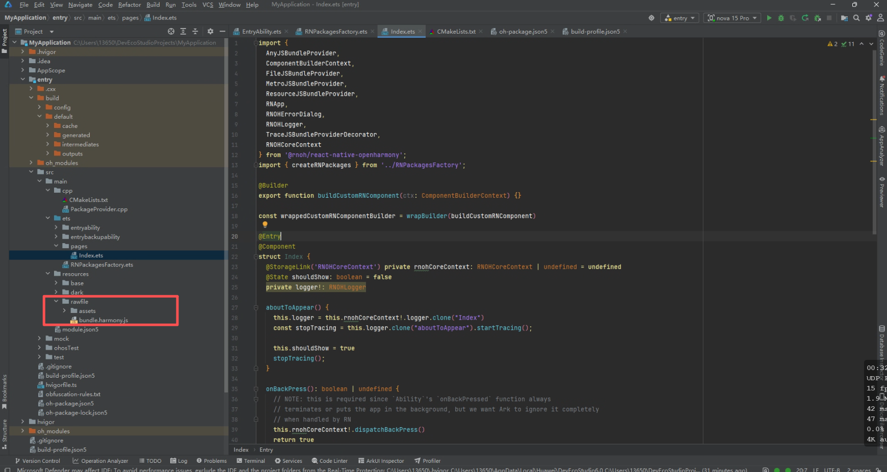 我们在从零学习RN for OpenHarmony踩坑日记(二)https://blog.csdn.net/gaojw07/article/details/157292044中已经生成了bundle,此处只需要将其粘贴进入entry/src/main/resources/rawfile 路径下即可,并在 entry/src/main/ets/pages/Index.ets 中使用。