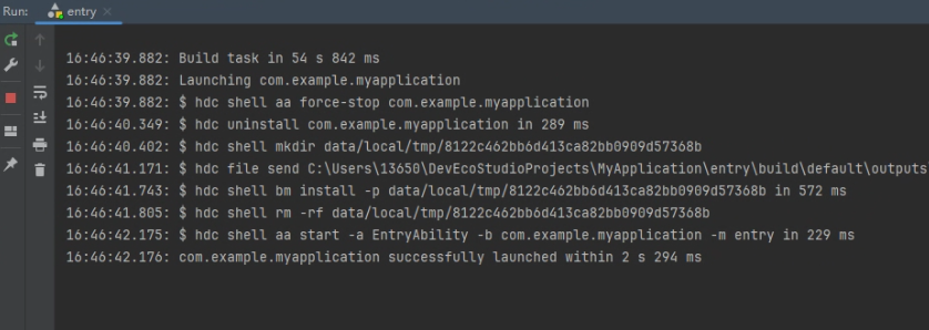 16:41:55.315: $ hdc file send C:\Users\13650\DevEcoStudioProjects\MyApplication\entry\build\default\outputs\default\entry-default-signed.hap "data/local/tmp/243d1319bd334876babe313110e563b7" in 737 ms