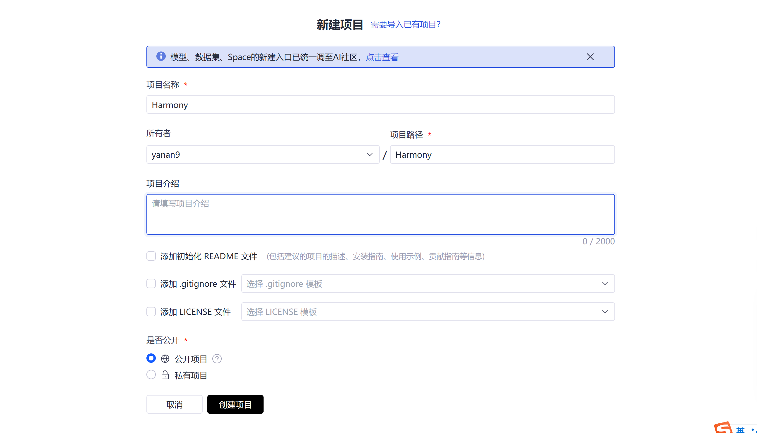 🚀我前期已经进行过Git和AtomGit的相关配置操作,整体比较简单就不再多余赘述,只要按要求一步一步做不会有很大问题,另外自己的账号信息仓库地址一定要几号不要忘记!在此我就只进行了新的项目创建,我们整理的鸿蒙系统我就简单命名Harmony,项目路径和所有者都是自动填充的不需要改变。其他的内容没有特殊要求就不需要管,直接点击创建项目即可。大家有问题可以提出一起探讨。